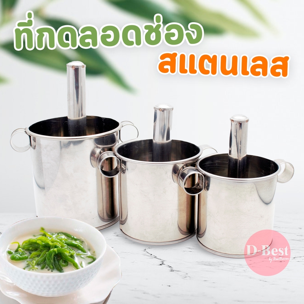 ที่กดลอดช่อง (เล็ก,กลาง,ใหญ่)- คุณสมบัติ ลักษณะของพิมพ์ลอดช่อง จะประกอบด้วยส่วนกระป๋องมีหู 2 หู และมีที่กดแป้ง รูที่ก้นพิมพ์จะมีขนาดกว้างประมาณ 2-5 มิลลิเมตรวิธีใช้ใช้ไม้ยาวขนาดพอที่พาดขอบถังหรือหม้อได้ 2 อัน สอดเข้าที่หูของพิมพ์วางพาดบนหม้อที่ใส่ น้ำเย็นไว้จนเกือบเต็ม ตักแป้งที่กวนไว้ ใส่พิมพ์ประมาณค่อนพิมพ์ ใช้ที่กดกดแป้ง ซึ่งต้องกดซ่าหริ่มยาวให้หมดทีเดียว![]() ![]() ![]() ![]() ![]() ![]() |